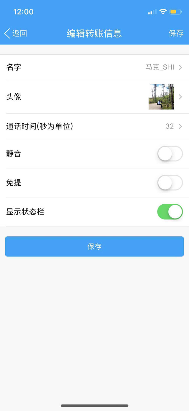 3.进入微信通话中编辑页面,可以设置通话人名字、头像、通话时间等,编辑完成后保存